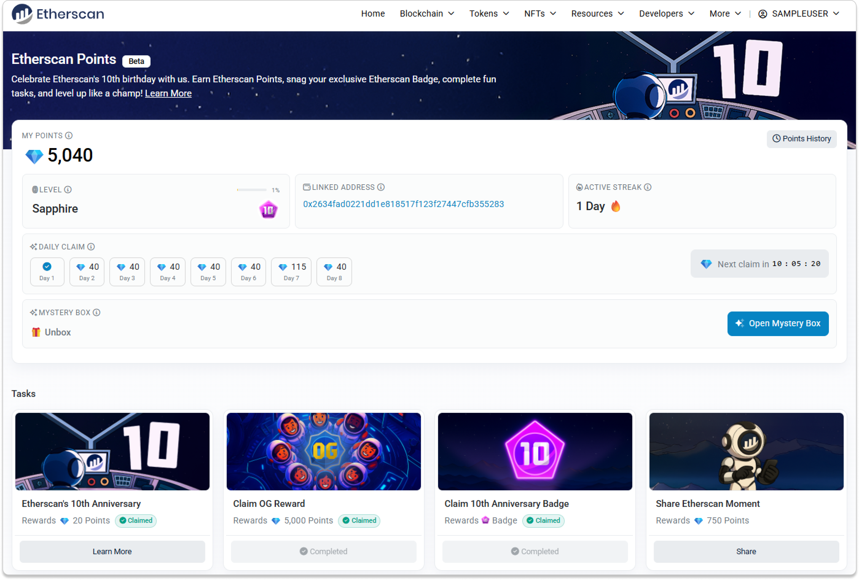 The anniversary celebration is live now (12th – 31st Aug 2025). Open the Points Hub to claim your Anniversary Points Bonus and 10th Anniversary Badge, check in daily, open your Mystery Box, ace a quiz, and share your Etherscan moment.