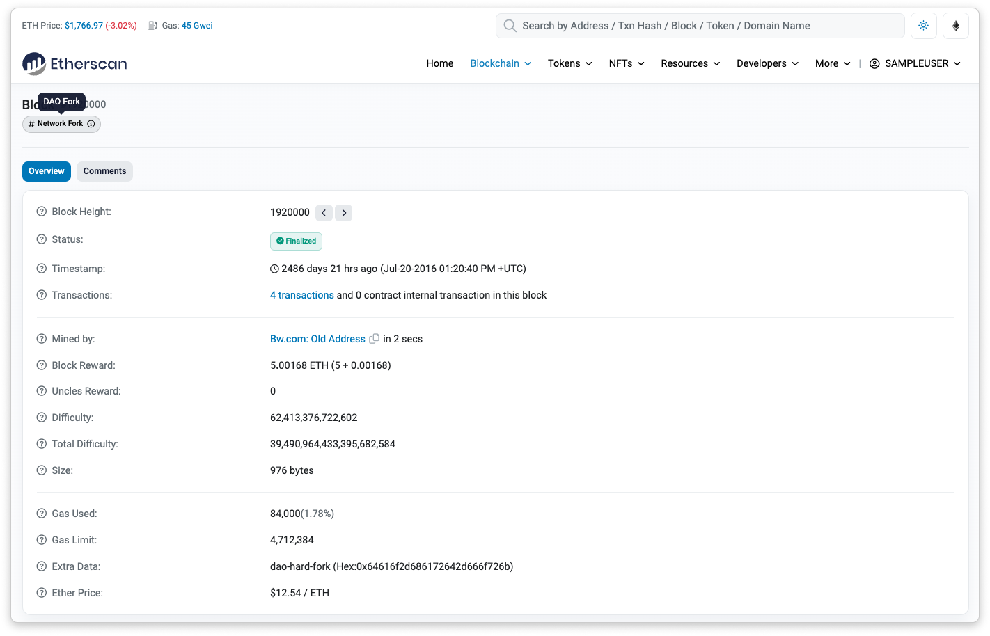 It may also refer to a contract named "The DAO" launched on 30th April 2016, which was then hacked in June 2016 and ultimately motivated a hard fork (codenamed DAO) at block #1,920,000 which reversed the hacked DAO contract and caused Ethereum and Ethereum Classic to split into two competing systems.