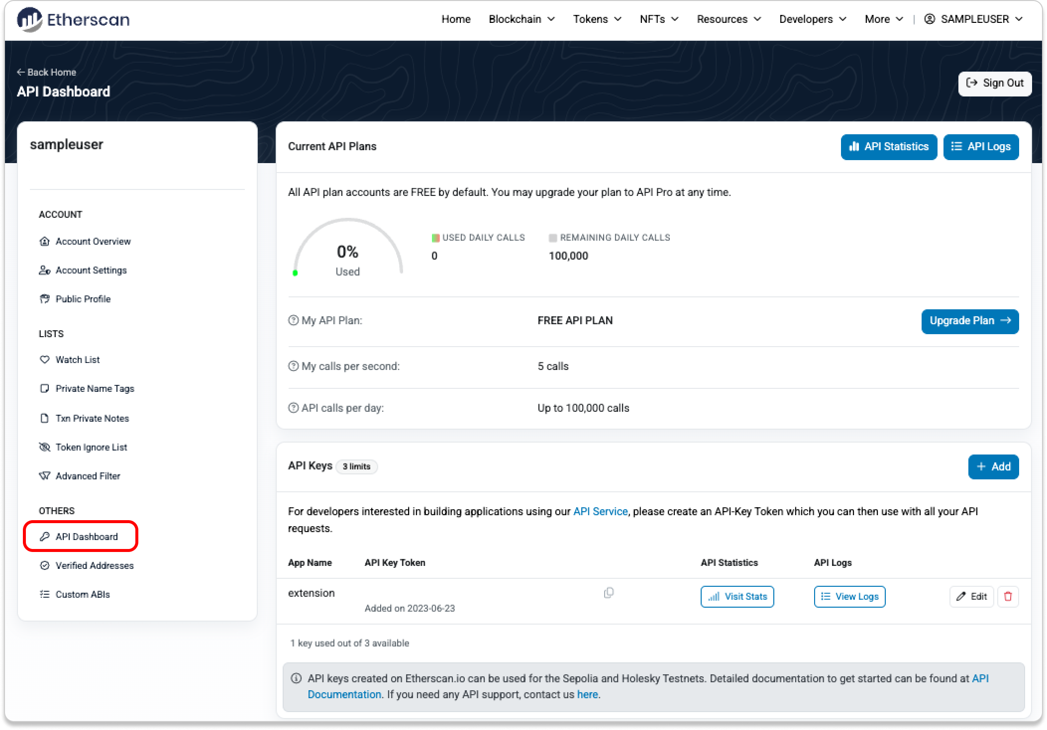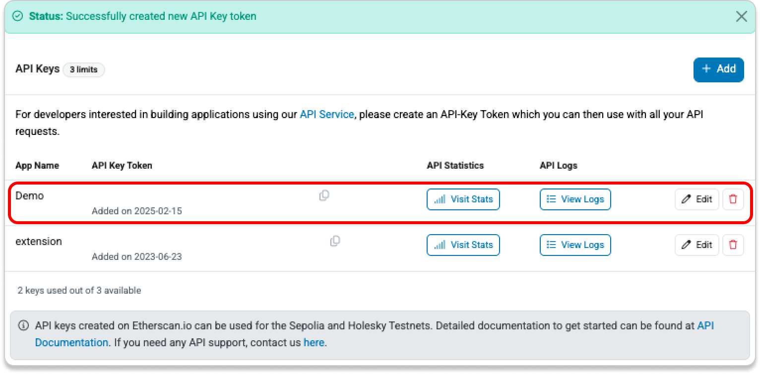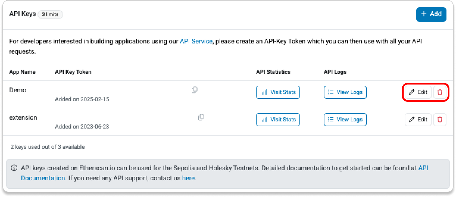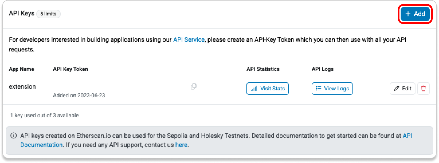 - The API keys created on Etherscan.io can also be used for the Sepolia, Holesky Testnets.