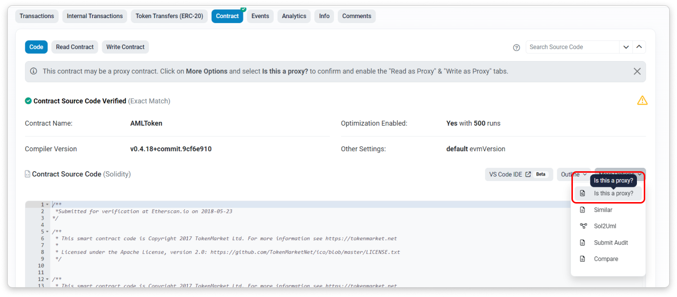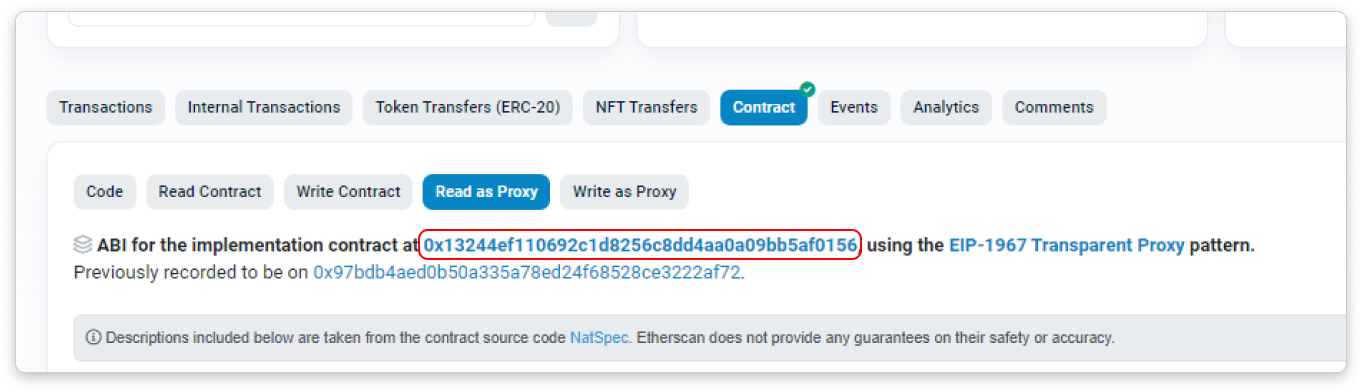 If the "Read/Write as Proxy" tab is not available, you can navigate to the button below, click "Verify" on the Proxy Contract Verification page, and copy the implementation address found: