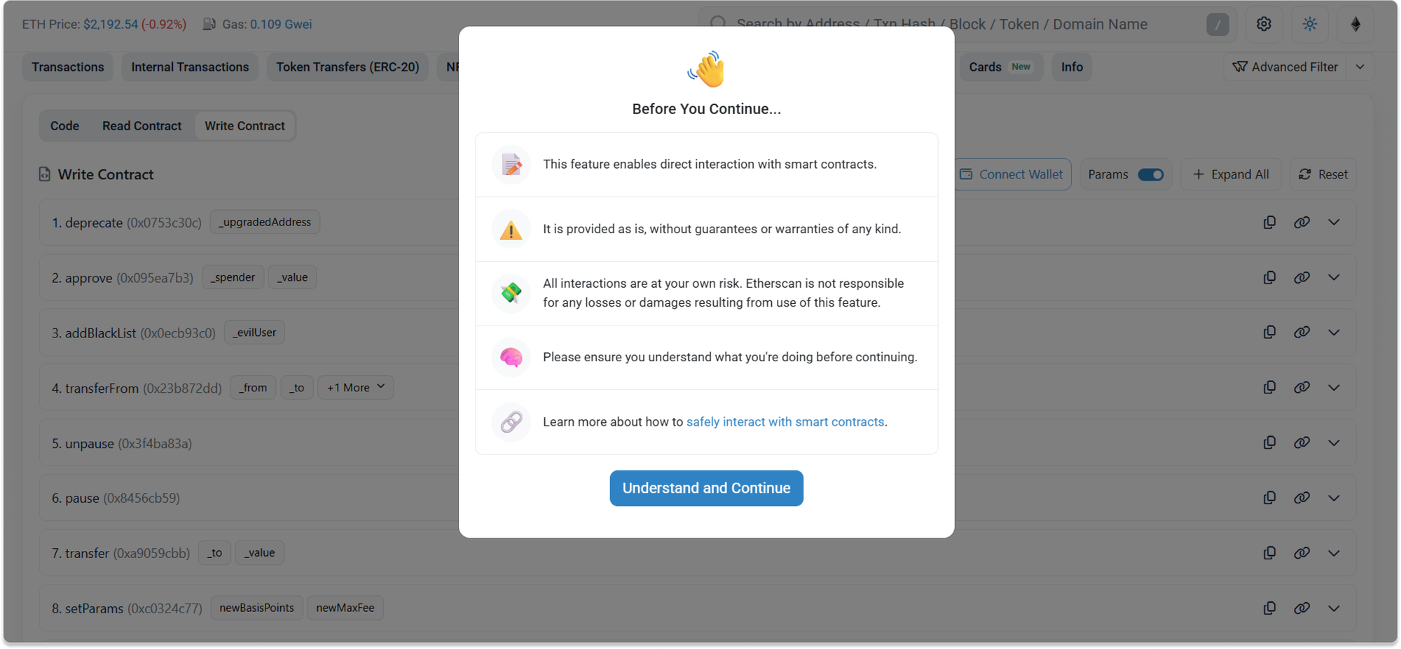 Etherscan helps you inspect and explore onchain data, but it does not audit or guarantee the safety of the contracts you interact with or the messages you are asked to sign with your wallet. You are responsible for understanding every signature and transaction your wallet approves.