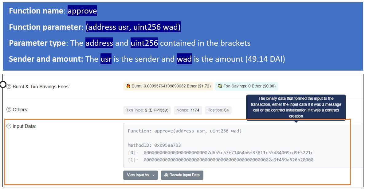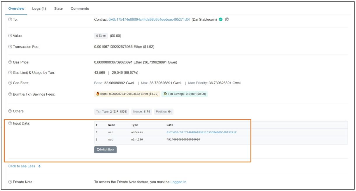 The transaction above is the approving of the DAI—to be spent on the Gitcoin: Bulk Checkout contract. The party performing the approving is talking to the DAI Stablecoin contract. Per the interaction, it is saying this: Gitcoin: Bulk Checkout should be allowed to spend the token. Where the status indicates “Success,” the meaning is this: the request for approval has been granted and the token can be spent on the Gitcoin: Bulk Checkout contract. Now, let’s see the interaction displayed in the Input Data field: