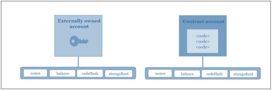 - Ethereum accounts: the two types are (a) Externally owned accounts and (b) Contract accounts