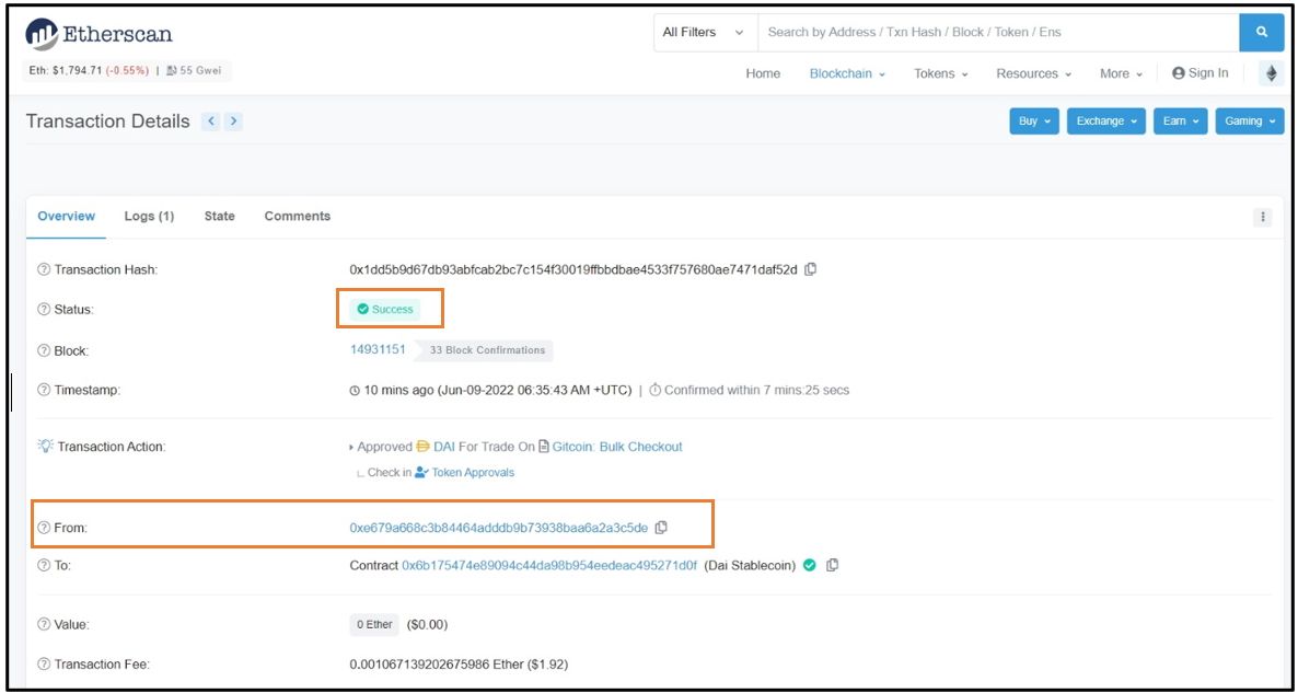 In this case, the externally owned account made a call to the DAI smart contract asking to allow Gitcoin: Bulk Checkout to spend its token (DAI). The call-to-action here is a request for approval. The “From” field above represents the party executing the transaction.