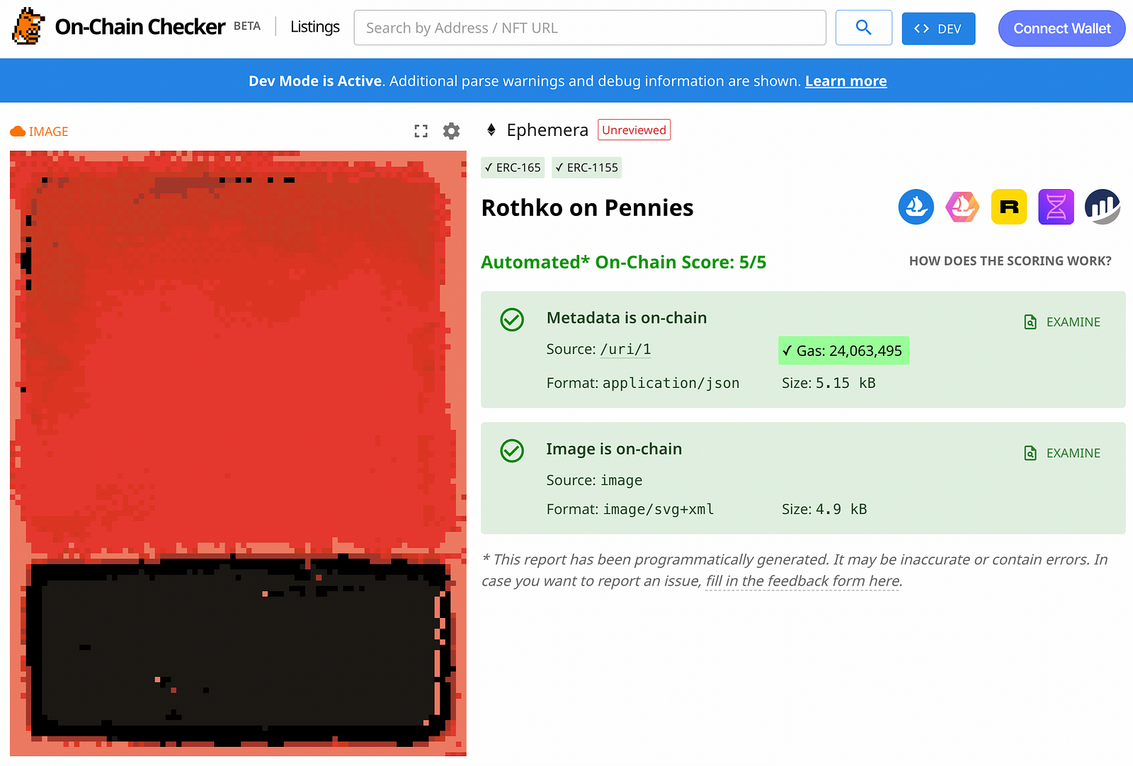 I sent the transactions. A few moments later, I refreshed the amazing On-Chain Checker platform that calls data from the contract directly. The pixelated on-chain rendering of Rothko’s red glowed on the screen, the scratch still there. A moment of sheer delight.