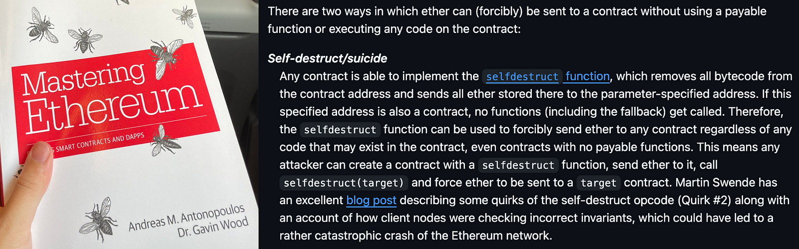 Fun history: This vulnerability was one of a bunch discussed in the “Mastering Ethereum” book by Antonopoulos and Wood years ago. It was fun to revisit these passages in the book, which I own and love, and see early discussion about how this is typically perceived as a potential attack surface for a hack: