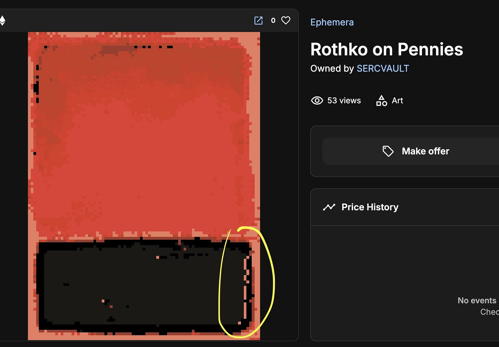 This post is about an amazing NFT project on Ethereum called “Rothko on Pennies” and the events surrounding it — including my own participation. This project and its provocations illustrate that the artistic character of a project goes well beyond just the instant glimpse of its visual form. On public blockchains, where code is (or, might be) “law,” artwork can solicit interventions, extensions, and hacking. A work’s meaning evolves sometimes in surprising ways even to the original creator. And on a blockchain, that meaning takes technically curious forms, even using tools typically reserved for more malicious intents but deployed for better purposes: hacking art, or hacking as art.