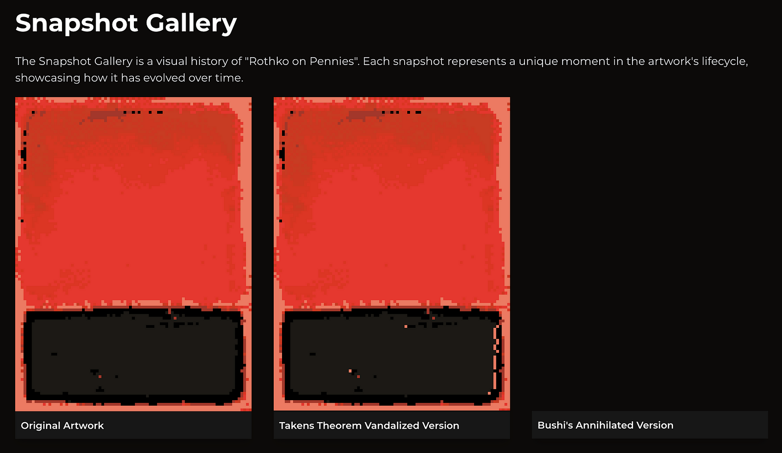 Rothko on Pennies was an incredibly rewarding exploration of Ethereum as an artistic canvas. Takens Theorem’s work, along with the element of ‘vandalization,’ elevated the entire narrative, showcasing the potential of multiplayer interactive art on Ethereum. I’ve long been inspired by the pioneering artists in the on-chain art space, and with this project, I hope to have sparked some inspiration in others.
