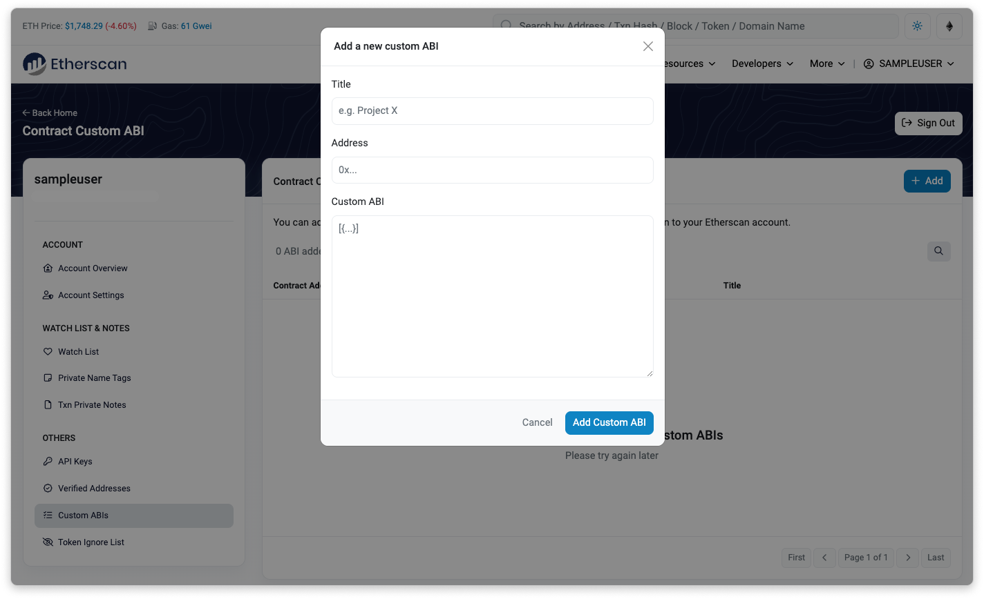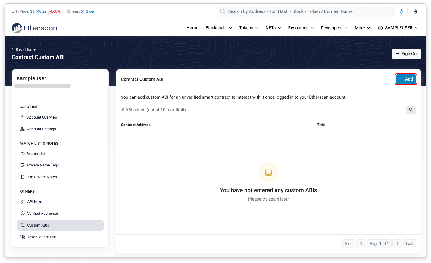 To use this feature, developers would need to log into their Etherscan account. Once logged in, go to Custom ABIs, and on the right of the dashboard, click Add.