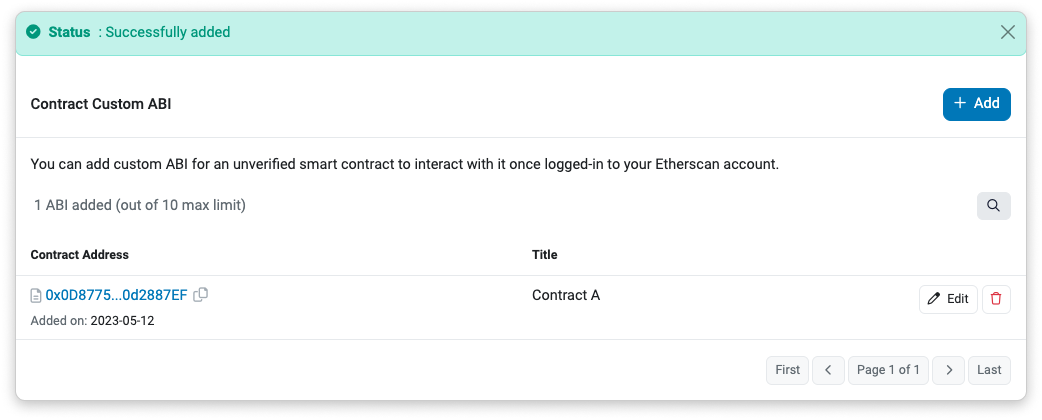 When added, the contract will be listed on your dashboard for easy access. You can click on the contract address listed on your dashboard to view the newly added custom ABI.