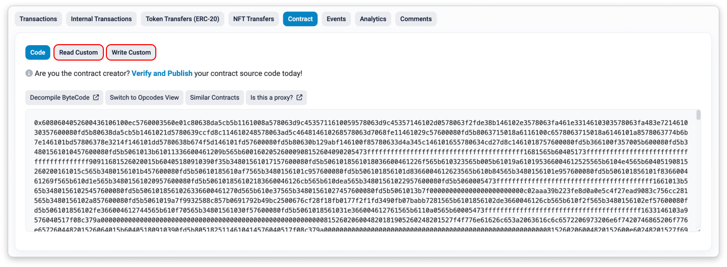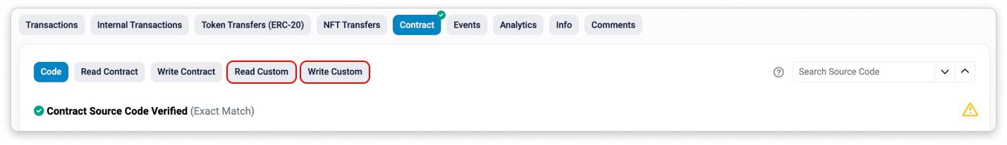 If the contract source code is verified, the Read Custom & Write Custom contract tabs will show alongside the existing Read Contract & Write Contract tabs.