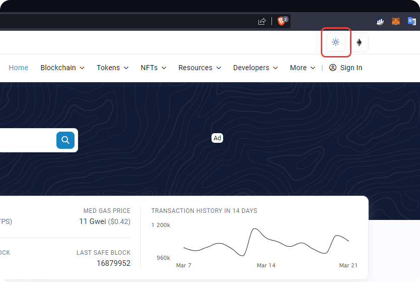 To access the feature, click on the Day/Night Mode toggle switch located next to the Ethereum logo at the top right of the website (refer to the screenshot below).
