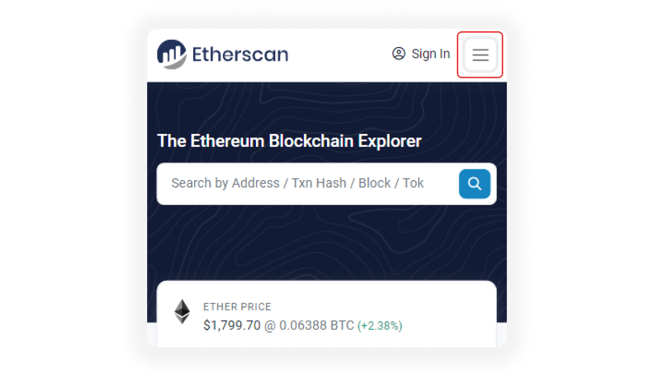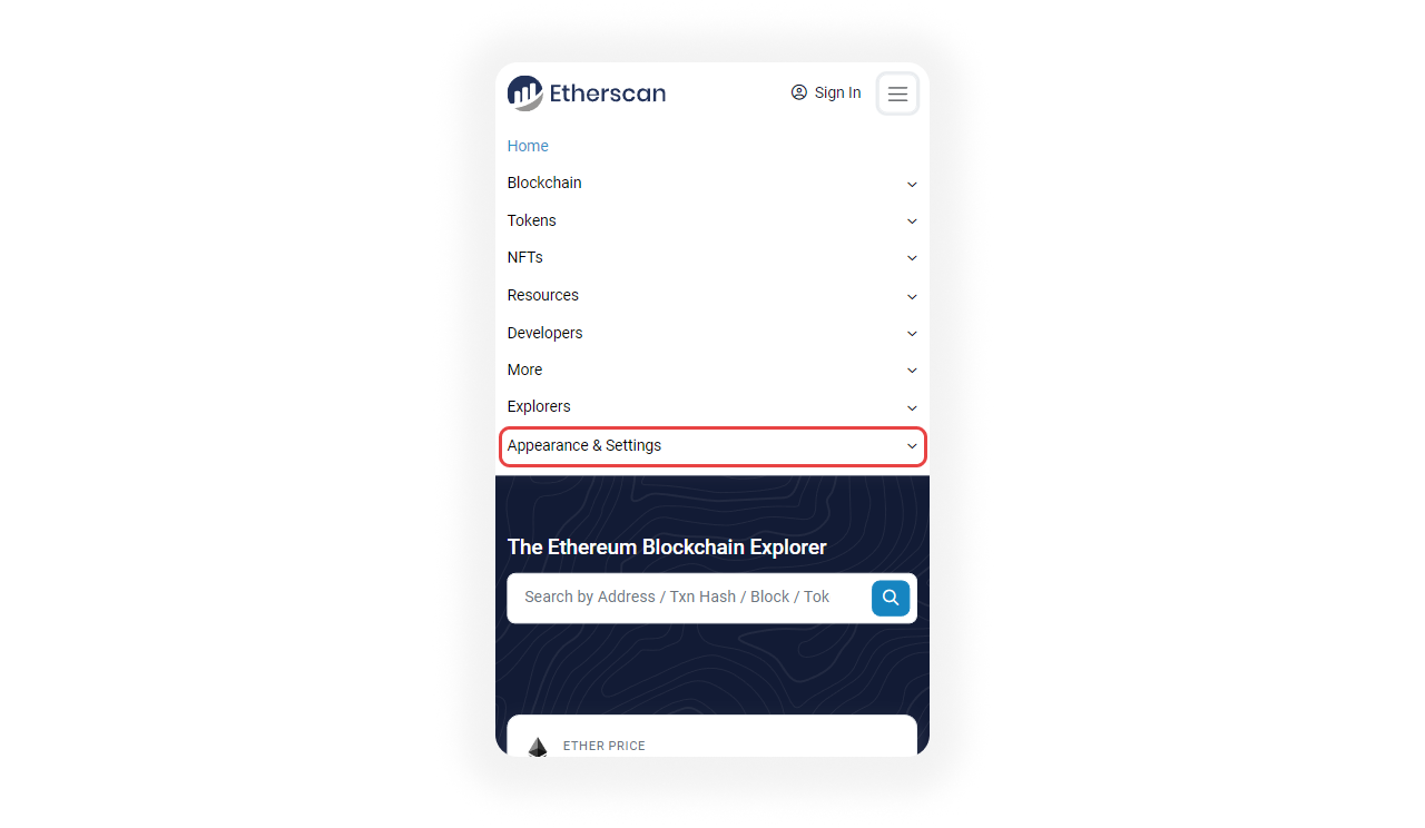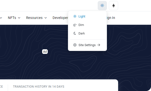 From here, you can view the Etherscan website in Dim or Dark mode on mobile.