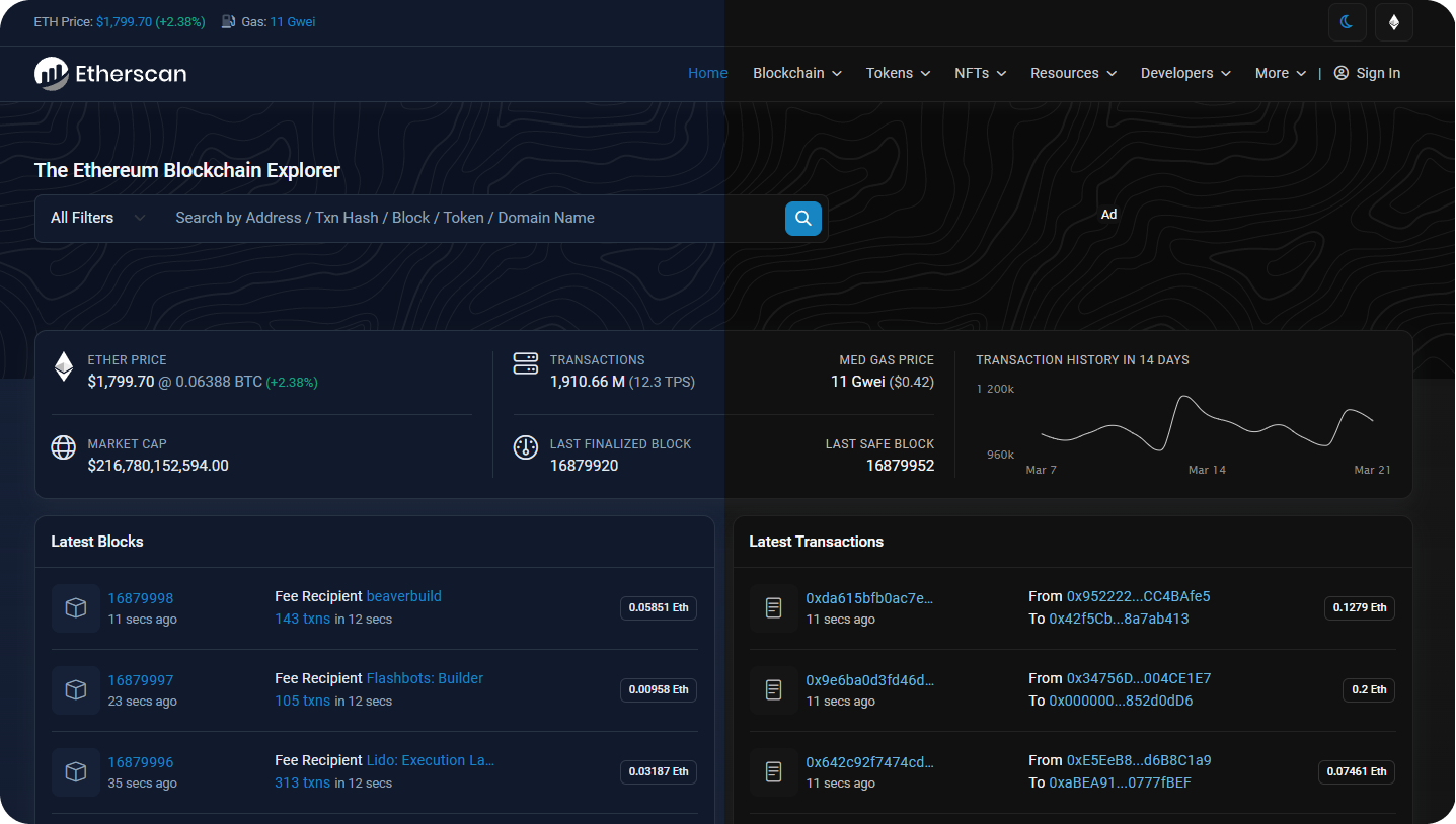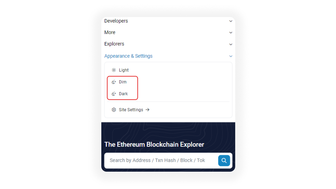Users and developers can now switch between Light, Dim, and Dark Mode on Etherscan for a better viewing experience.