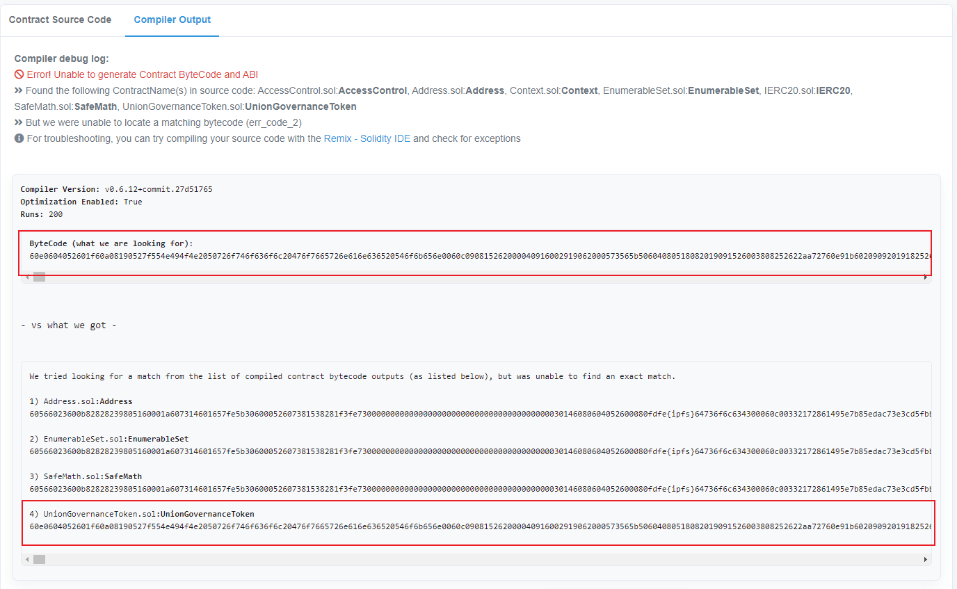 When a contract source code verification failed as shown below, you will be given the bytecode deployed on-chain and the compilation results from the source code you have provided.