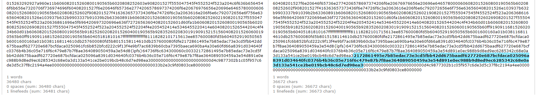 For the next step, you would need to copy and compare the bytecode between "what we are looking for" and the contract you are trying to verify under "what we got." When comparing side by side as below, you can spot the differences in the bytecode.