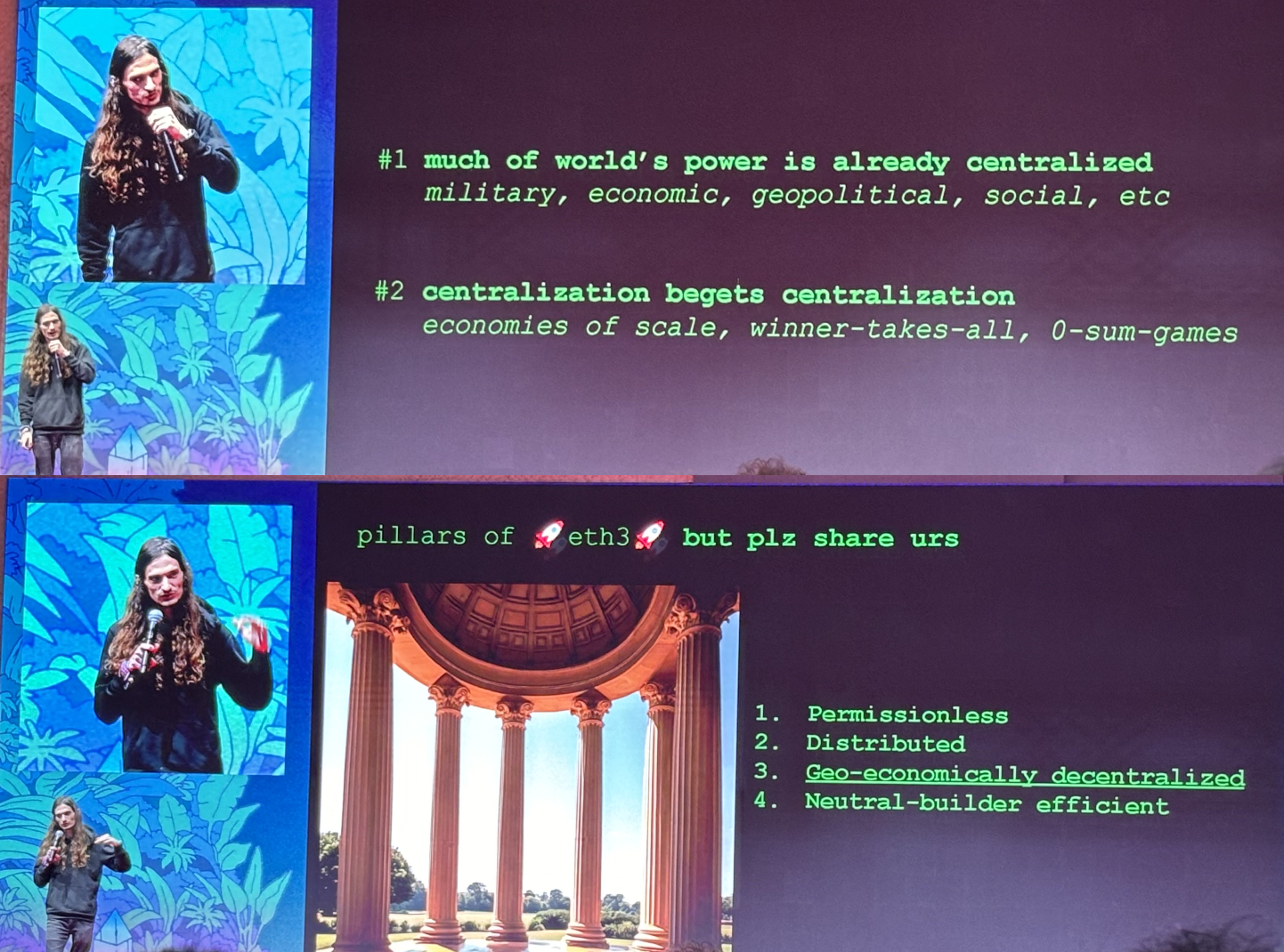 Daian outlined four non-negotiable pillars of Ethereum: permissionlessness, distributed power, geo-economic decentralization, and neutrality. Any compromise on these pillars, he argued, risks undermining Ethereum's mission.