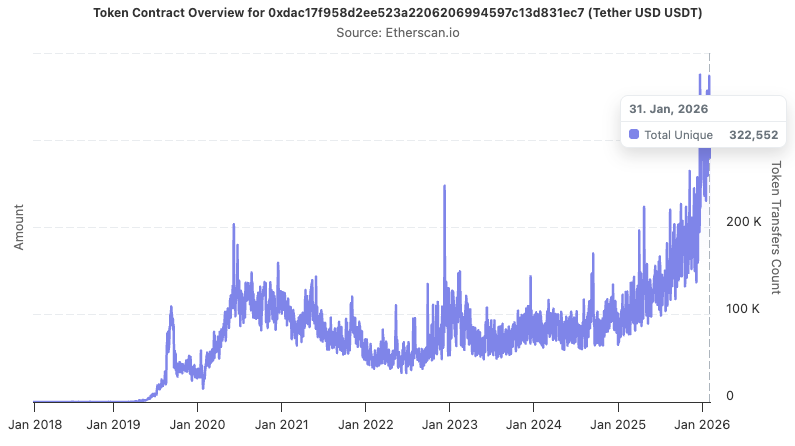 Tether’s USDT now has hundreds of thousands of transacting addresses per day on Ethereum mainnet alone.