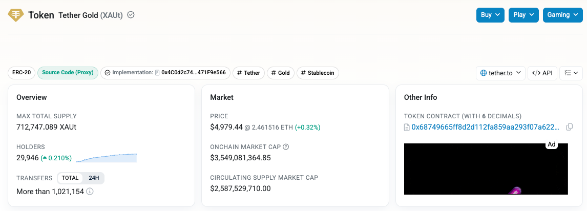 Tether reports XAU₮ having over $2 billion in USD-equivalent market capitalization. Its Jan. 2026 reserves report breaks down the number of gold bars it contains. In total, Tether’s custodian holds over 16 tons (520,089 “troy ounces” of gold). Investors can gain exposure to this commodity by purchasing this ERC-20 on chain (though registration is required).