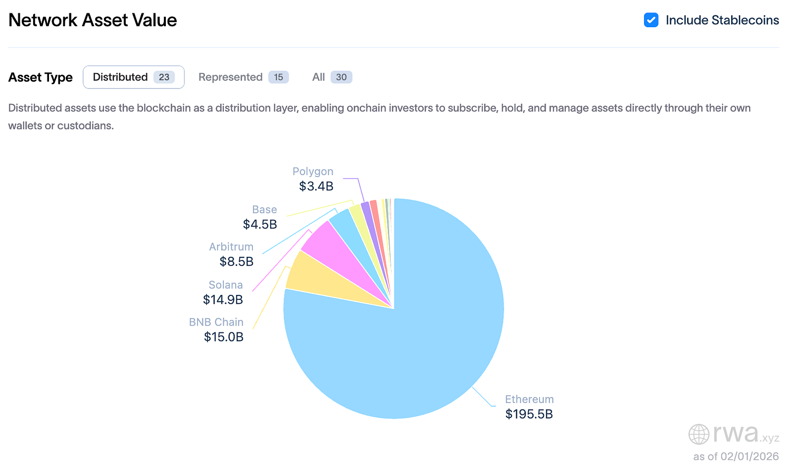 Together with Paxos Gold (PAXG) these two Ethereum digital assets represent the majority of commodity RWAs represented on chain. According to analysis by RWA.xyz, Ethereum dominates in the representation of RWAs.