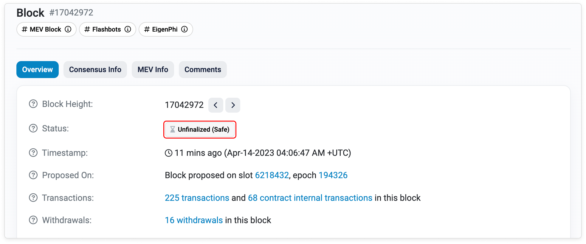Unfinalized (Safe) status refers to the block that has been validated by two-thirds of the validators set. While it is still unfinalized, the block has a low possibility of being reorganized.