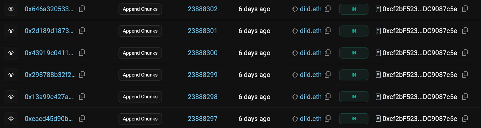Just this past week the largest NFT ever stored on-chain was achieved by artist diid. A 10-megabyte video was uploaded to an NFT contract and required 191 transactions. Intriguingly, diid seems to have abided by the new per-transaction gas limit before Fusaka was released, keeping each “append” operation, which stitched the video data together, to about 16,171,465 gas (the new limit is 2²⁴ = 16,777,216).
