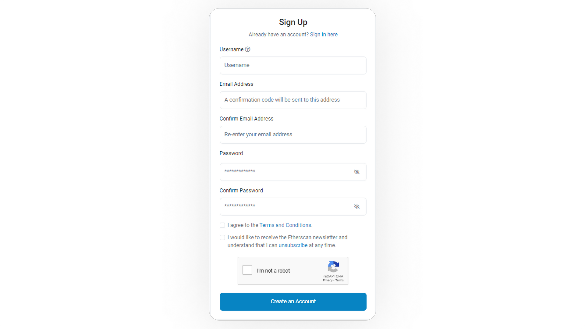 - Fill in your desired Etherscan Username, email address and password in their respective fields.