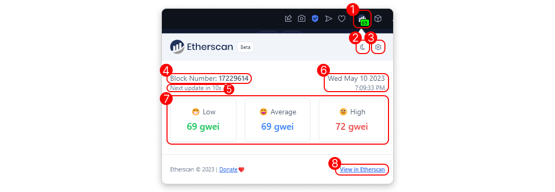 - Next Update: This shows the countdown to the next refresh of the block number and gas prices.