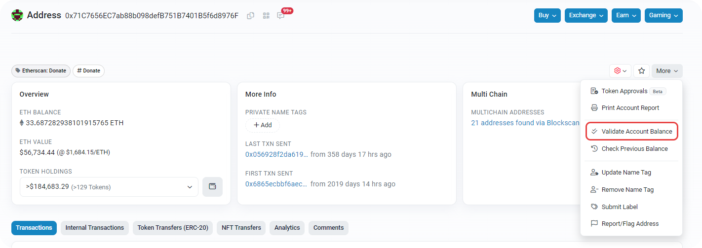 On Etherscan, users can validate their account balances by clicking on More> Validate Account Balance. This will bring open up a new page that shows the account balances, values in different currencies, and other information related to the address from other Ethereum nodes like Infura, Chainstack MyEtherWallet, MyCrypto as shown below:
