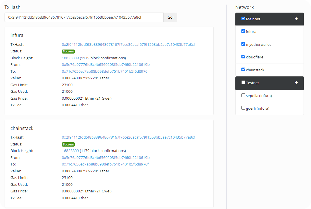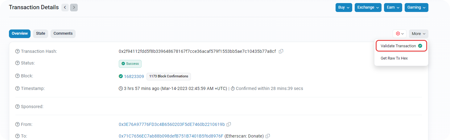 Other than validating account balances, EthValidate also allows users to validate transaction statuses and token balances across other nodes.