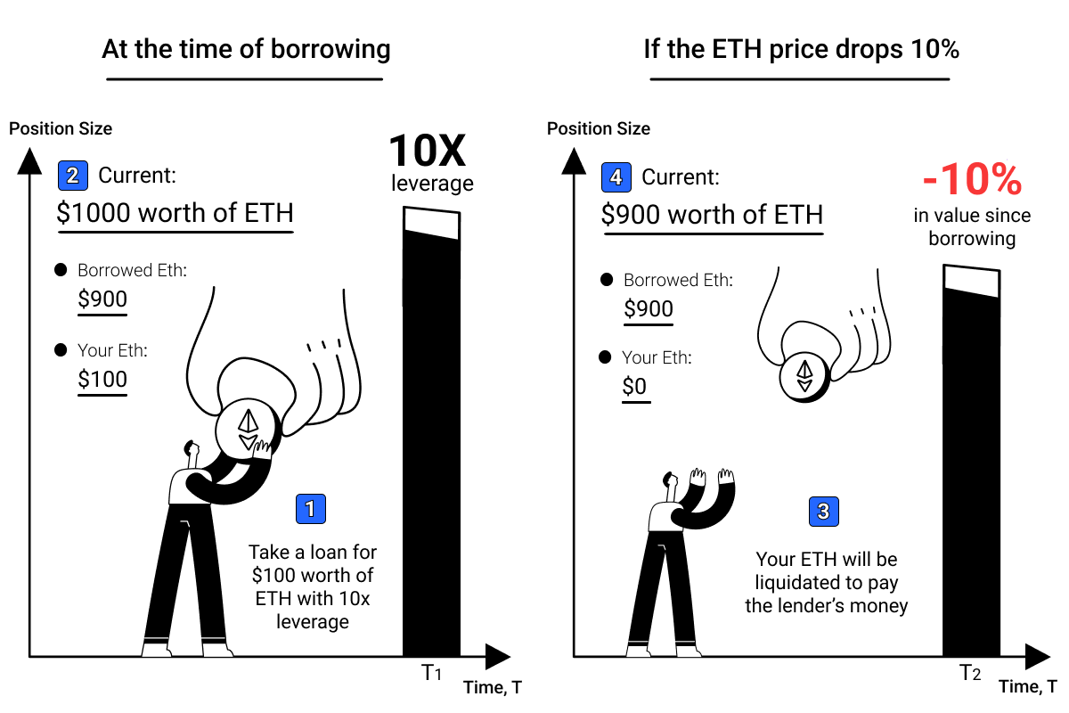 If you take a loan for $100 worth of Eth with 10x leverage, you are in a position size of $1,000 worth of Eth at the current time. Which means, you borrowed $900 worth of Eth along with the initial $100 of Eth you had earlier. If the Eth price drops 10%, the $1,000 Eth worth at the time of borrowing is now $900,and if more losses are incurred, the borrowed fund would be affected. Obviously, the lenders would not want to risk their funds on your behalf, so your fund will be liquidated to keep the lenders money safe.