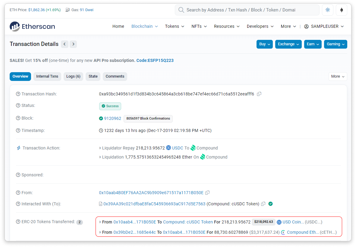 After taking a long position on ETH, a user was unable to maintain their position when the price of ETH suddenly dropped, which caused the user's position to become liquidatable. The resulting liquidation process was carried out by a liquidator who repaid 218k USDC on behalf of the user, and in return, the liquidator received 88k cETH worth of collateral as a reward.