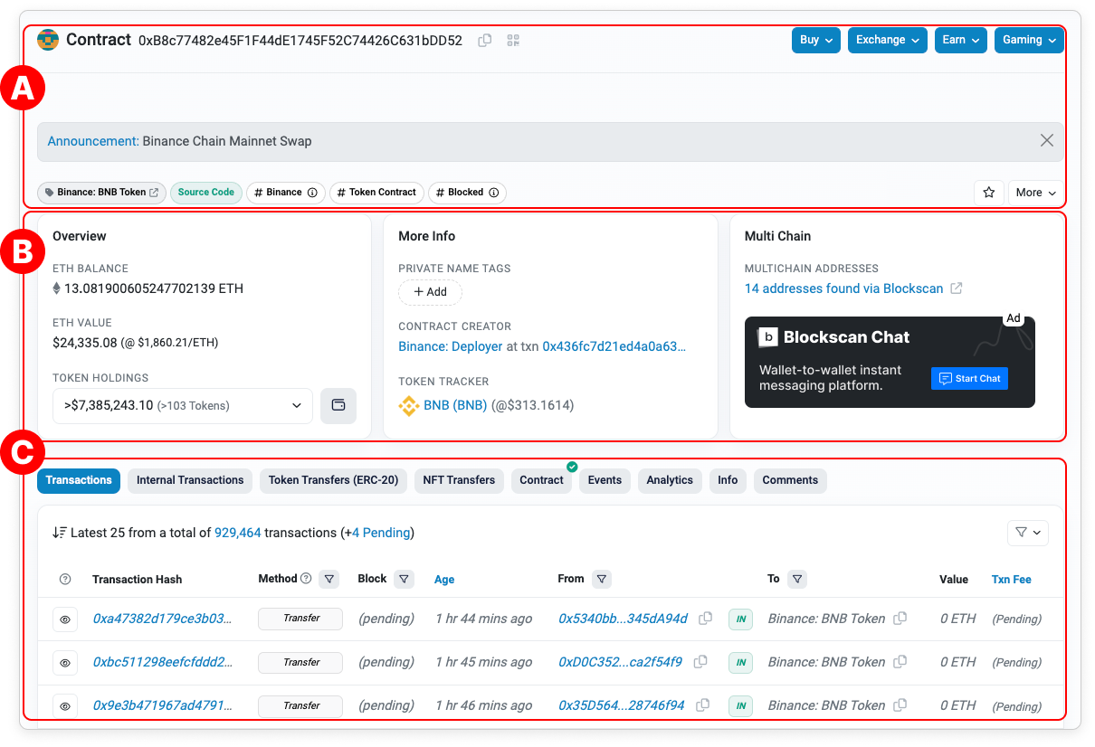 - Token Tracker: If it is a token's contract address, the name, ticker and logo of the token will be displayed here. Also, clicking here will direct you to the Token's page where all on-chain and off-chain data of the token are available (kindly take note that off-chain data such as price, official website, social media, etc. are only available if the token creator has submitted them to us).