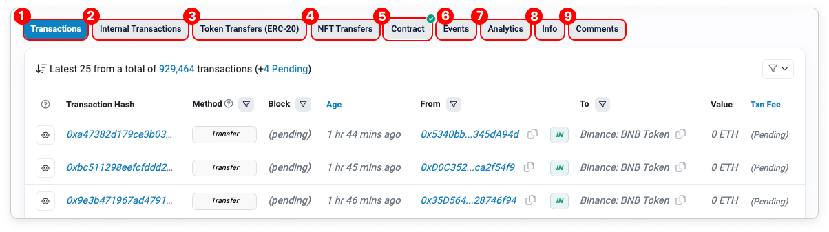 - Token Transfers (ERC-20): The ERC-20 token transfer history is located under this tab and is separated from the ETH transactions under the Transactions tab.
