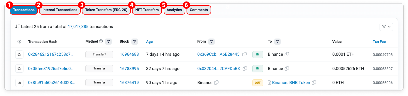 - Token Transfers (ERC-20): The ERC-20 token transfer history is located under this tab and is separated from the ETH transactions under the Transactions tab.