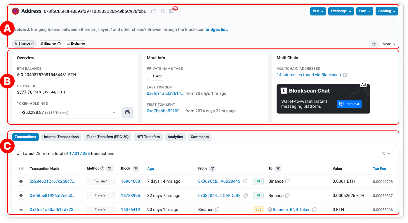 Users can bring up any address page on Etherscan by searching for an address using the search bar that is present on every page of our website. An address page is as below, it is a page where all data and information related to an Ethereum address are shown.