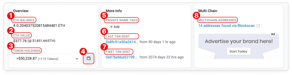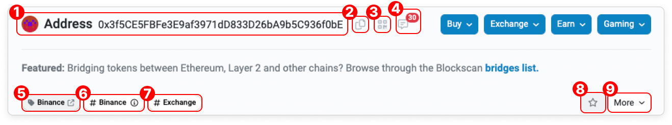 - Public Label: This label shows the sector/industry/service that the address is in. Examples of other categories for the label are Exchange, Old Contract, DeFi, and Stablecoin. For the full list of all available labels, visit here.