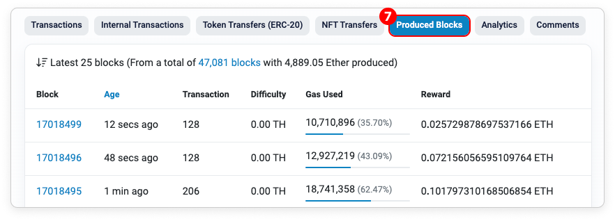 - Produced Blocks: This tab shows all the related information on the blocks produced by the address. The tab is only visible for the MEV Builder address.