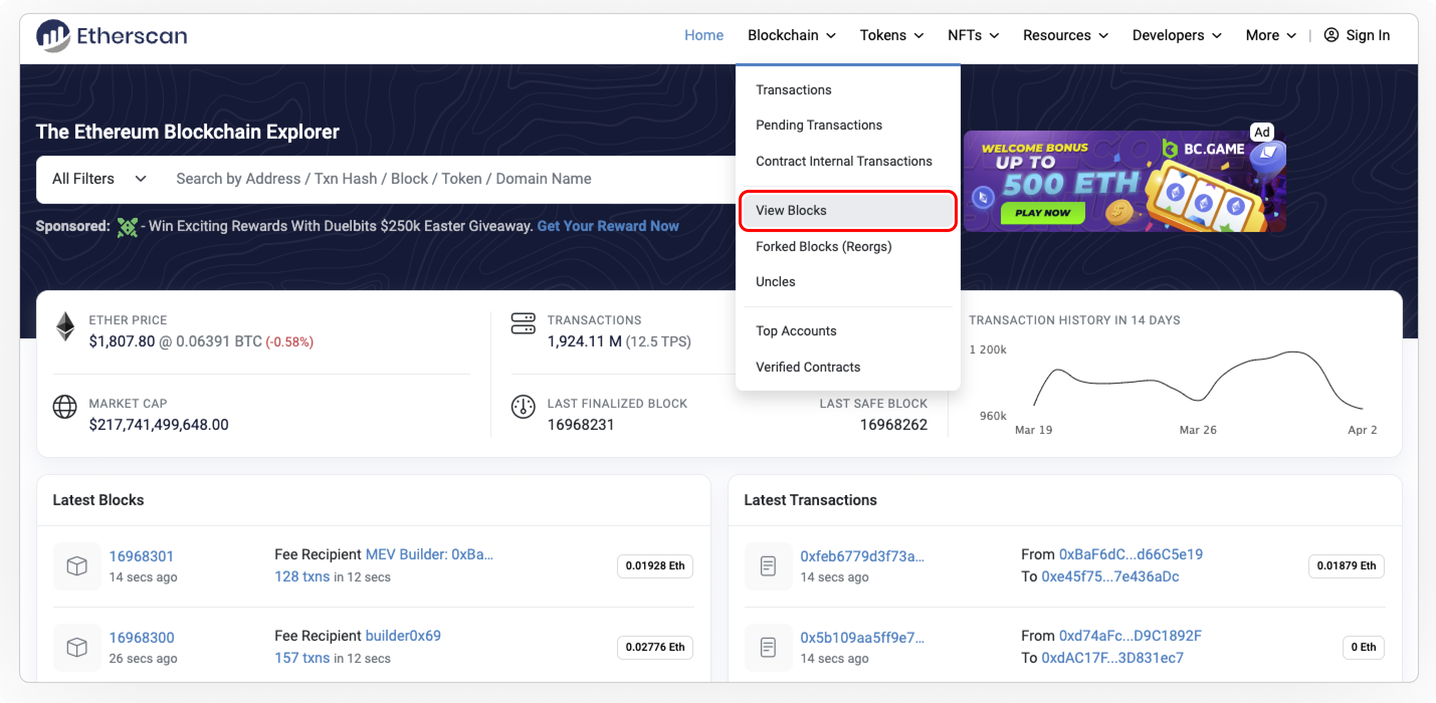 Users can view more blocks detail by going to Etherscan's View Blocks page.