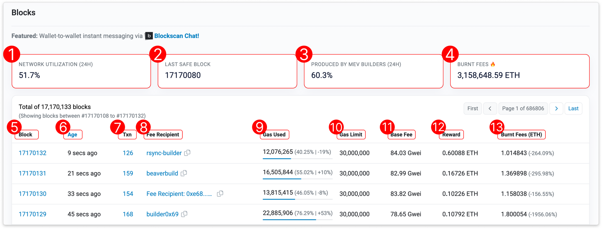 - Gas Used: The total gas used in the block. The gas used percentage (out of the total gas limit) as well as the percentage of gas used over the gas target, was also included.