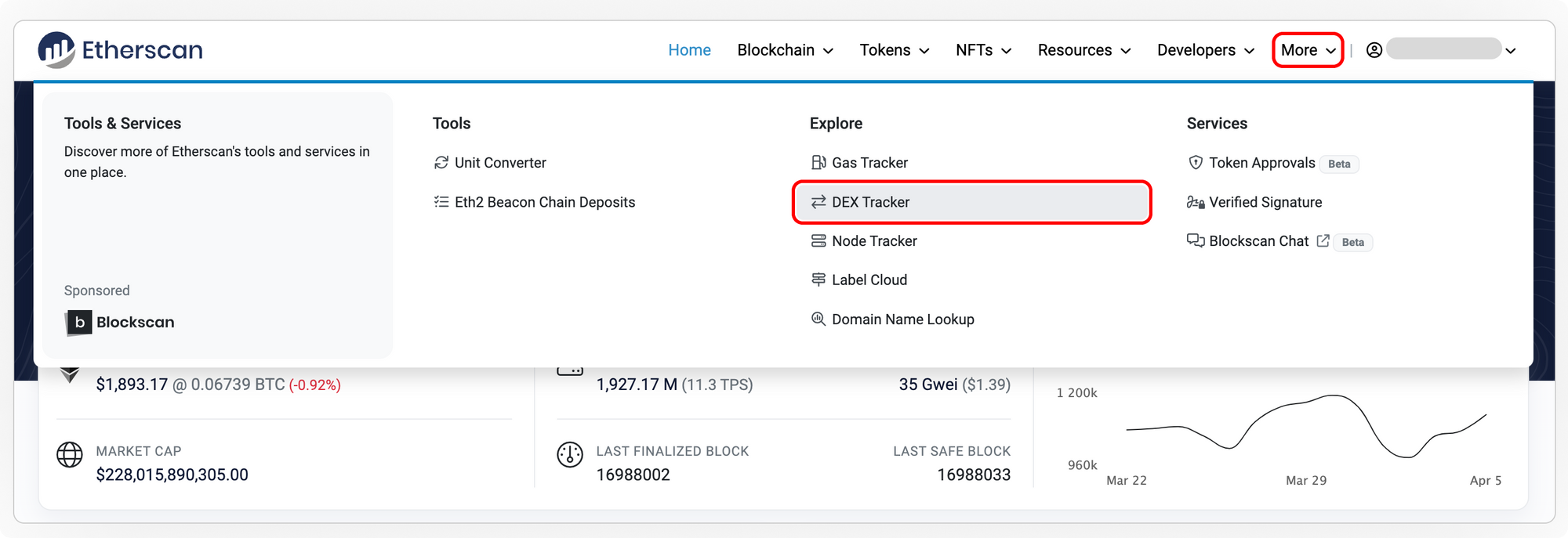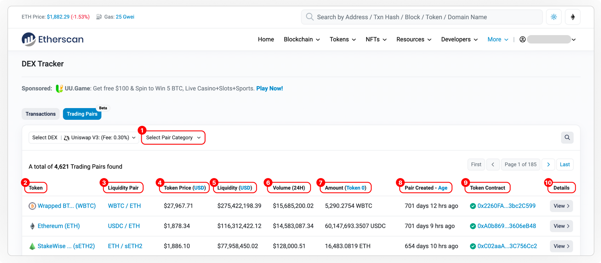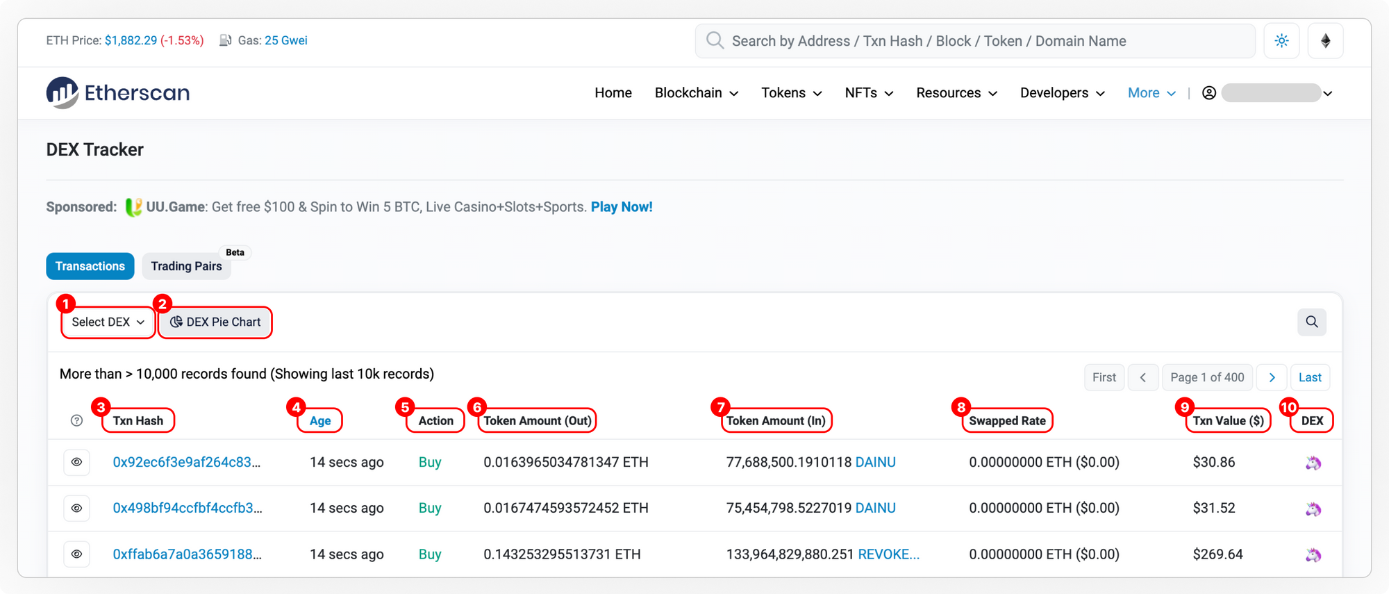 Etherscan’s DEX tracker tracks all trading transactions from the list of supported DEX. You may also find in-depth information about a selected pair such as its price chart and most recent transactions.
