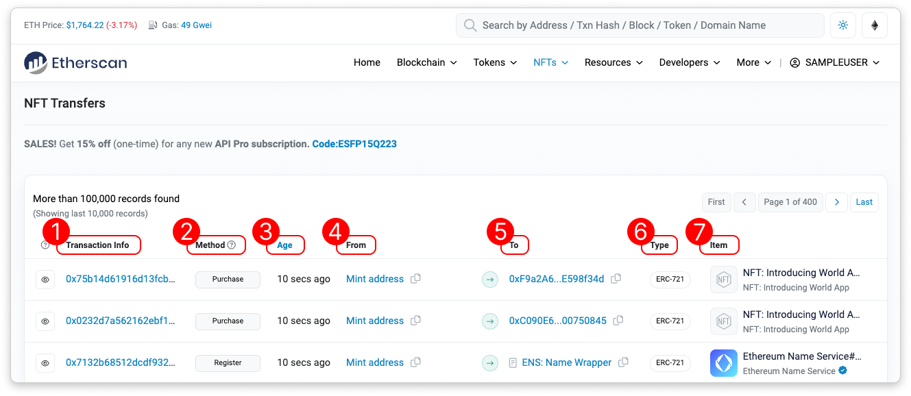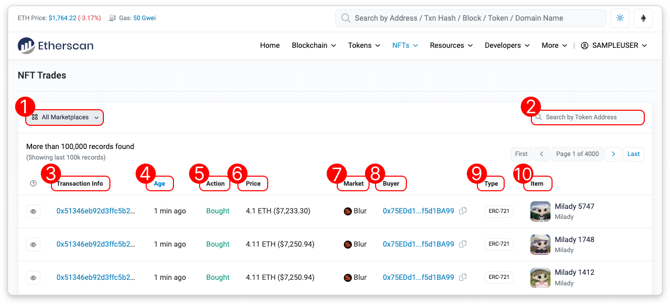- Age: This shows the time elapsed since the NFT trade was executed. Click to toggle to DateTime (UTC) format.