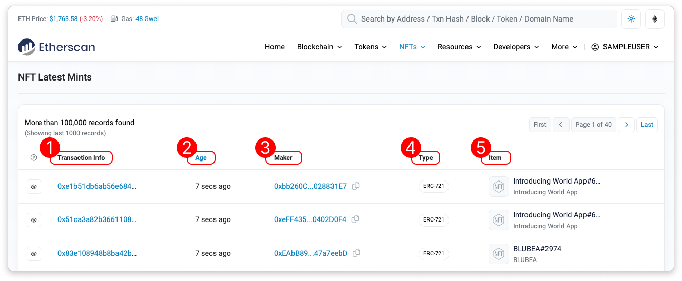 - Age: This shows the time elapsed since the NFT mint was executed. Click to toggle to DateTime (UTC) format.