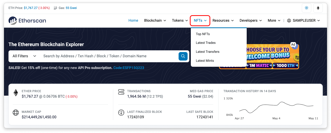 The NFT tracker page allows users to view the Top NFTs, Latest Trades, Latest Transfers, and Latest Mints.
