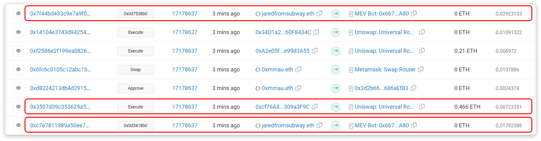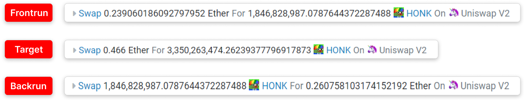 The MEV bot identifies a regular transaction in the block that it wants to execute the sandwich attack on. The bot then arranges its own transactions in a way that they come before and after the regular transaction.