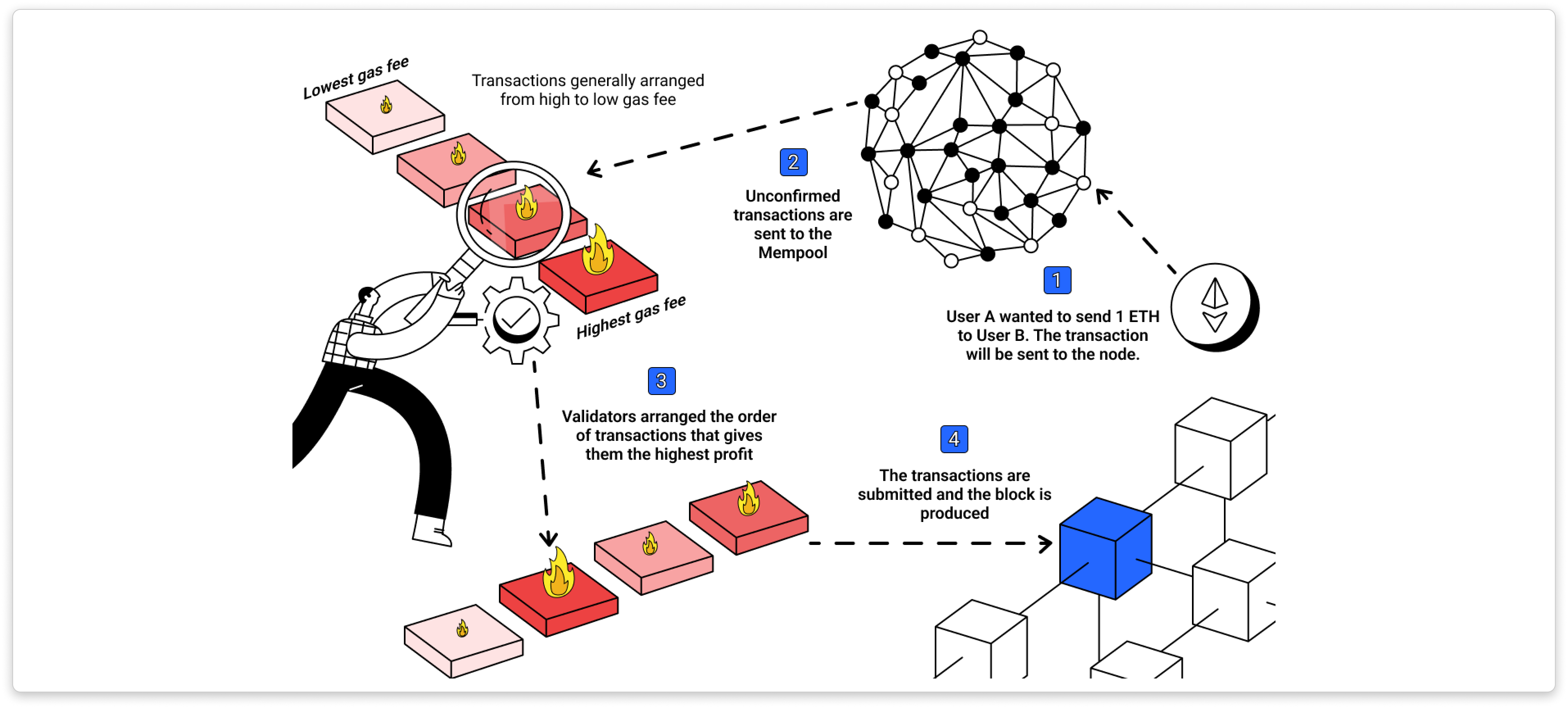 MEV is a design by-product from block building since the current blockchain does not have rules on content ordering in the block. By design, validators can arrange the ordering of the transactions before submitting them to the block. The order is usually arranged from the highest to lowest gas fee to maximize profit.