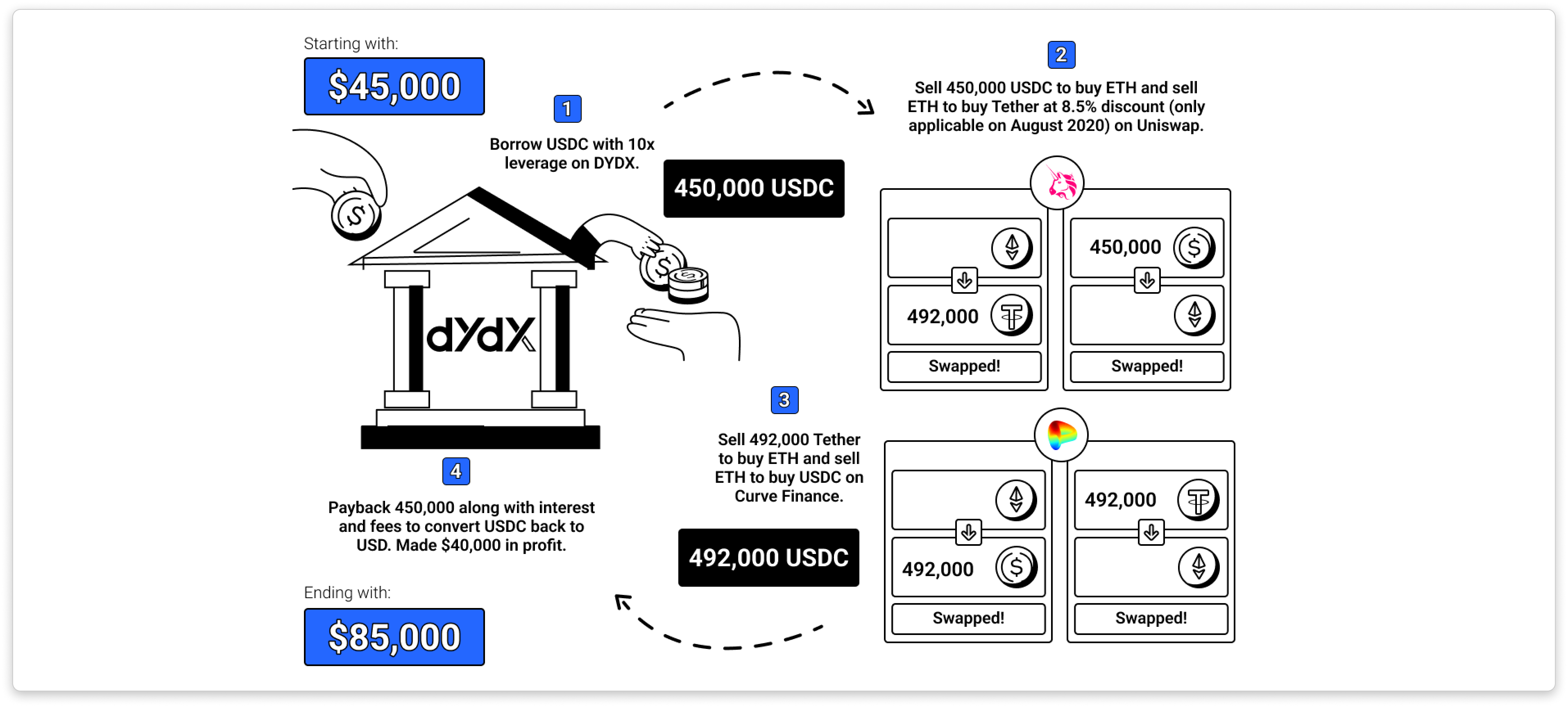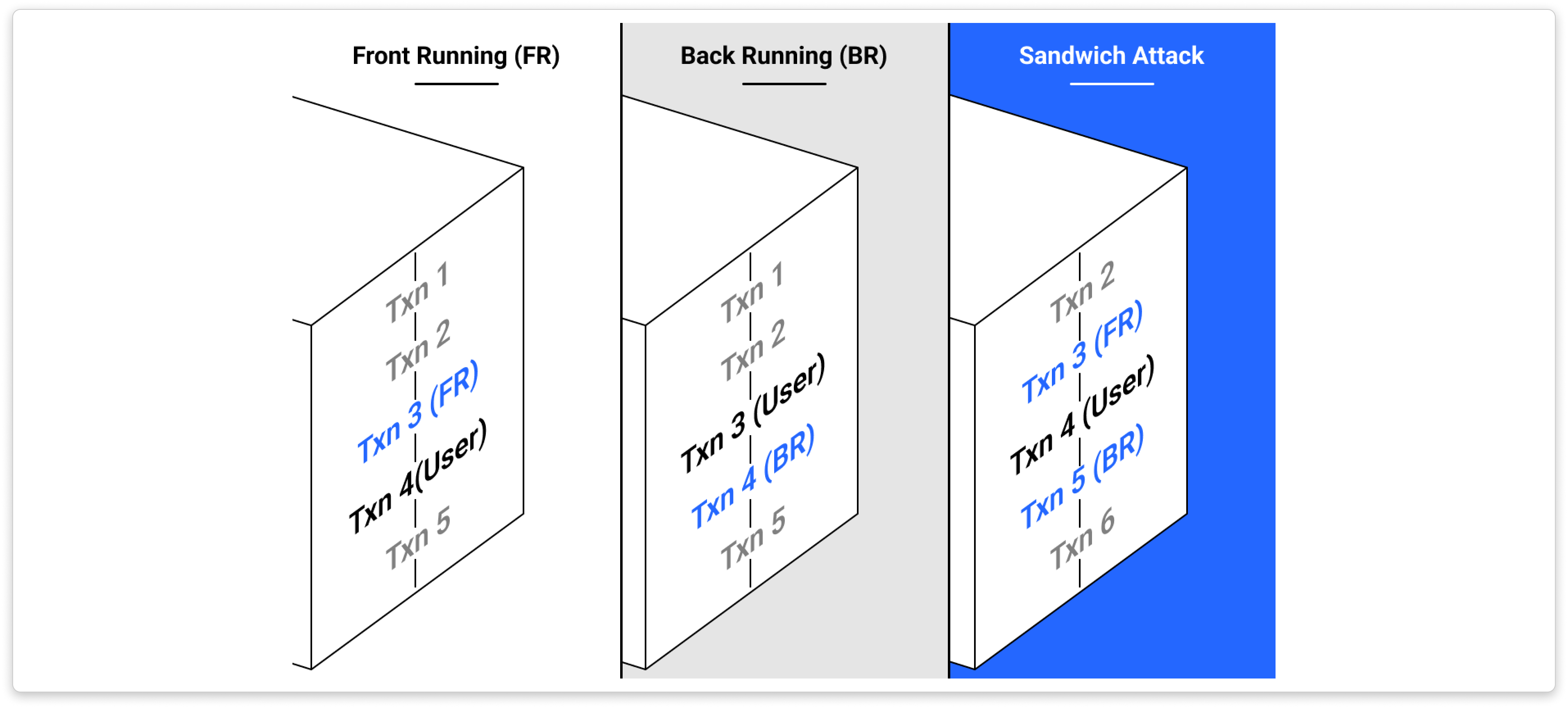 For example, suppose Alice wants to send a large amount of cryptocurrency to Bob. The attacker, who is aware of Alice's transaction, submits their own transaction to buy a small amount of cryptocurrency from Alice at a low price, and then immediately submits a second transaction to sell the same amount of cryptocurrency to Bob at a higher price. By doing this, the attacker is able to extract value from Alice's and Bob's transactions, essentially "sandwiching" their own transactions between the two.
