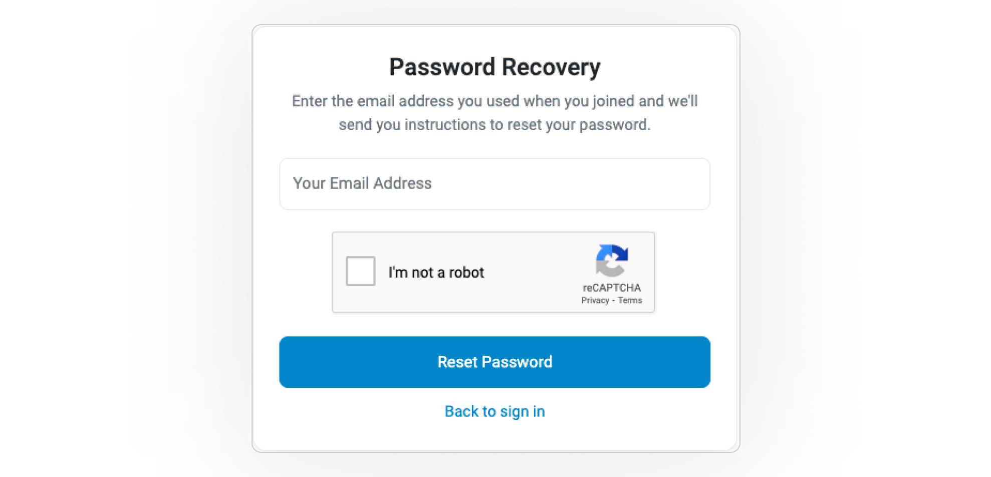 - Enter your registered account's email address, clear the reCAPTCHA test and click on Reset Password.