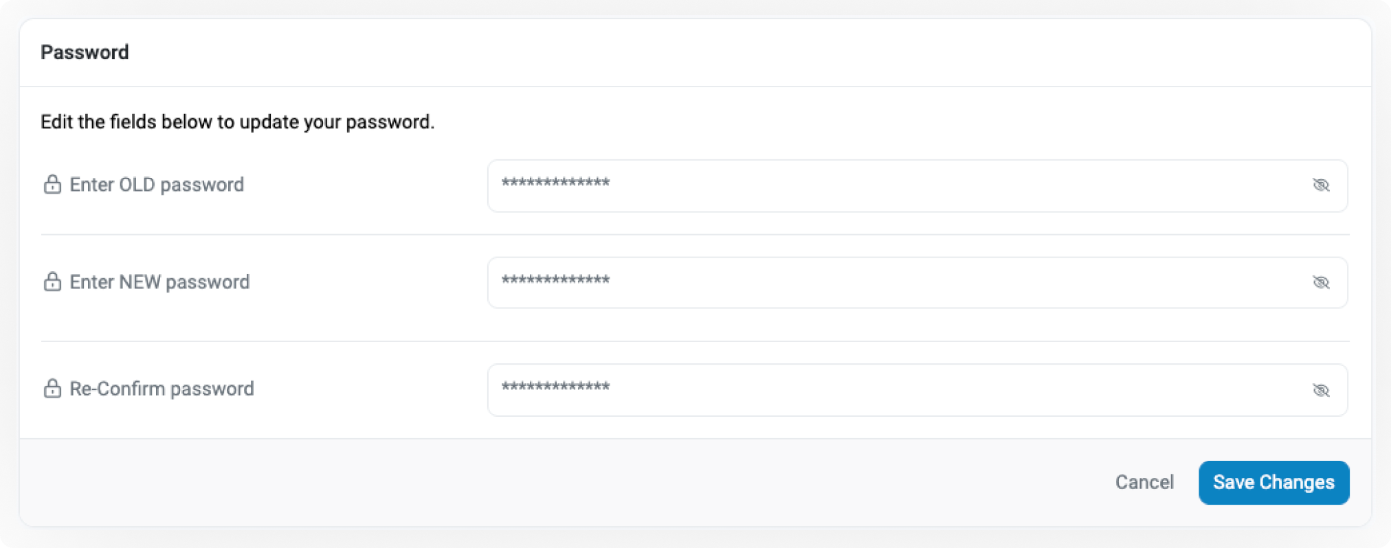Note: When changing the account's password after logging in using the temporary password, enter the provided temporary password in the Old Password field (not your previous password before resetting the account's password). Please refer below: