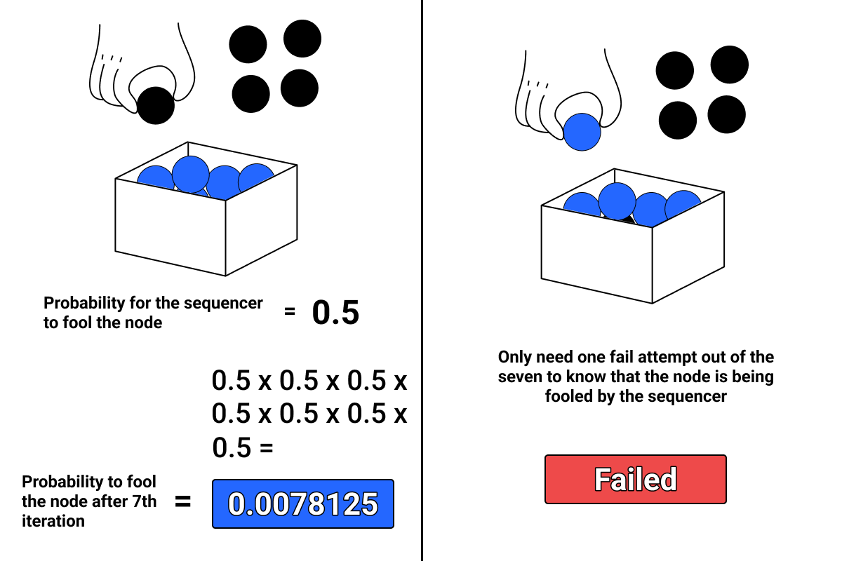 Erasure coding reduces the likelihood of full nodes being fooled by the sequencer in the event of misbehavior. This is because the sequencer must hold more than 50% of the data in order to successfully fool the full nodes. As a result, if this process is repeated over time, the likelihood of full nodes being fooled by the sequencer will decrease by 50% with each iteration. After the seventh iteration, the likelihood of being fooled will be less than 1%. Here is the permutation: